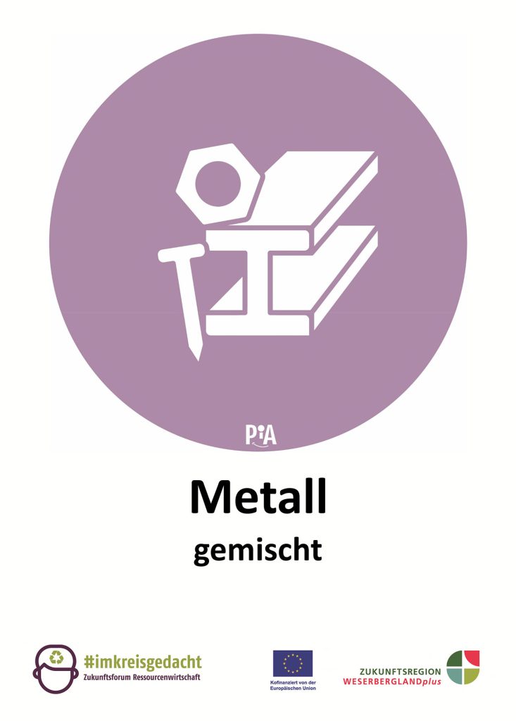 Teile/Gegenstände aus unterschiedlichen Metallen, wie z. B. Baustahlmatten, Benzinrasenmäher ohne Flüssigkeiten (Benzin, Öl), Bleche, Fahrräder, Heizkörper, Maschendraht (auch kunststoffummantelt), Metalljalousien, Metallträger, Metallwannen, Rohre, Spülen, Rechnergehäuse etc.